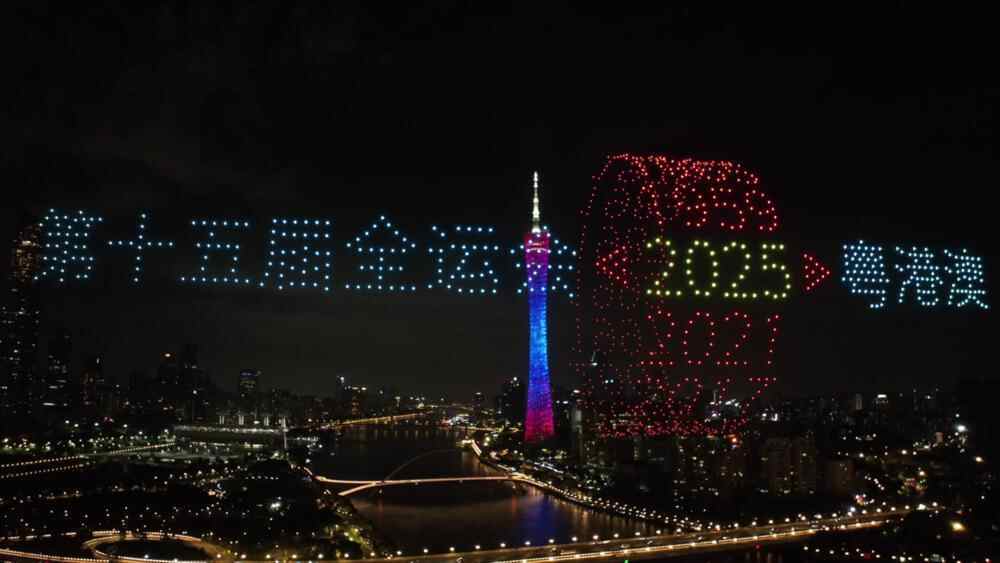 除了技术升级,千机科技在无人机表演画面上也追求创新。千机科技公共事务总监温瑶指出,从双“塔”辉映到吉祥物擎火炬而来,每一幅精心设计的空中画卷背后,都凝聚着编程、美学、导演等空中调度及跨学科团队的协同创作。“我们计划在‘全运会倒计时100天’这一重要节点,以‘广州百分百’为主题进行全新空中艺术创作,敬请大家期待。”