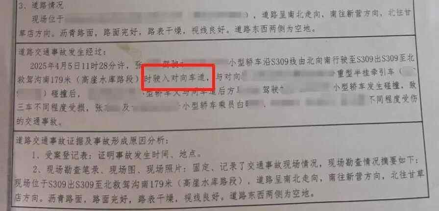 在白女士提供的一份由榆中县公安局交通警察大队出具的道路交通事故认定书中,记者注意到,“张某某驾车驶入左道发生交通事故,其行为违反了《中华人民共和国道路交通安全法》第三十五条‘机动车、非机动车实行右侧通行’,是引发事故的主要原因。”交警部门认定张某某承担事故主要责任,重型半挂牵引车司机承担次要责任,其余人员无责。