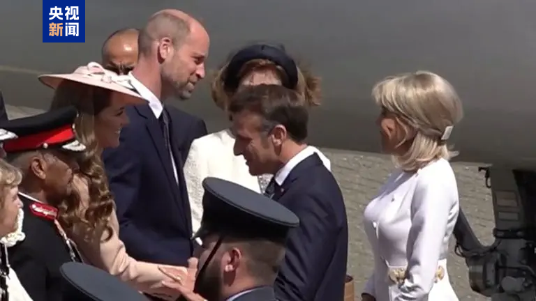 英国王储威廉及其妻子凯特王妃前往英国诺霍特皇家空军基地迎接马克龙及其夫人(上图)。