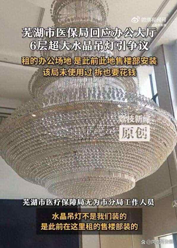 7月7日,安徽芜湖,一医保局大厅一盏6层超大水晶吊灯引发争议,网友质疑其价格。对此,芜湖市医保局无为市分局作出回应:该吊灯并非该局安装,是租用场地原有售楼部安装,医保局并未使用过此灯,但因拆除涉及费用,故予以保留。