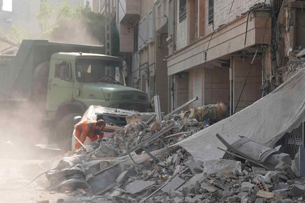6月13日,在伊朗首都德黑兰,救援人员清理在以军袭击中受损的建筑。新华社发