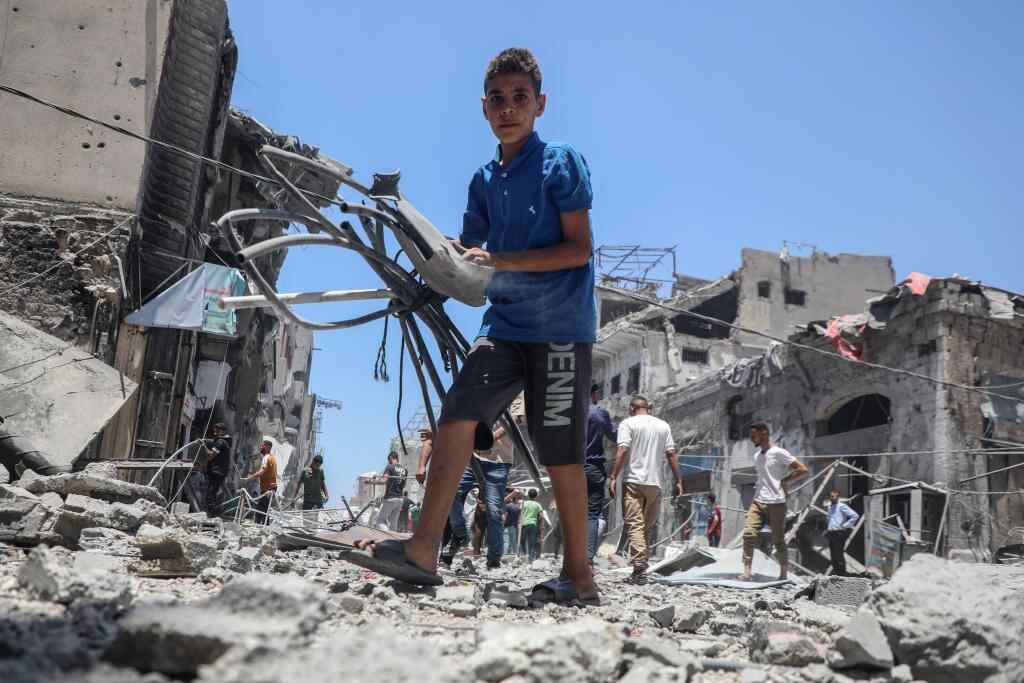 5月31日,在加沙城,一名青年在以军袭击后的废墟中搜寻物品。新华社发(里泽克·阿卜杜勒贾瓦德摄)