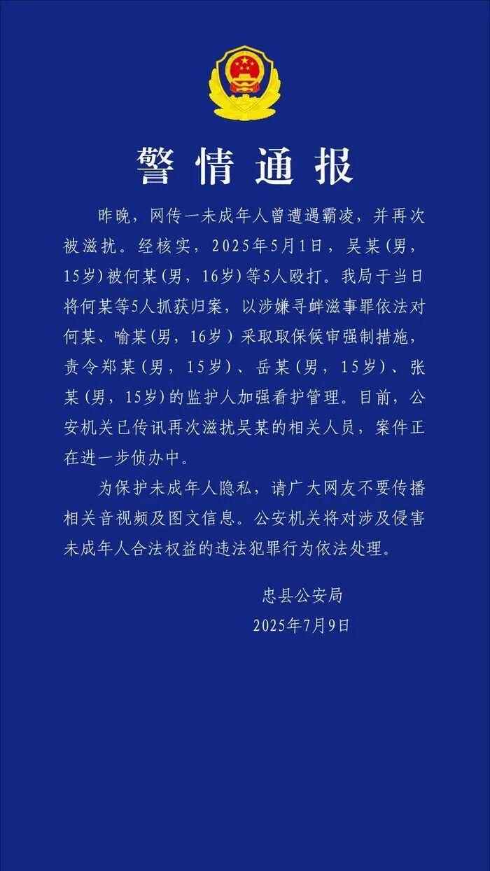 7月9日凌晨,重庆忠县公安局就网传“一未成年人曾遭遇霸凌并再次被滋扰”发布警情通报:
