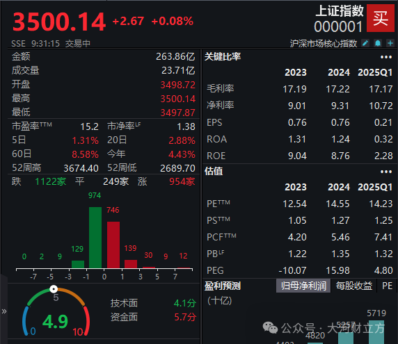 7月9日,A股三大股指开盘涨跌不一,沪指涨0.04%,深证成指涨0.04%,创业板指跌0.08%。开盘后,沪指上攻并站上3500点位,创年内新高。