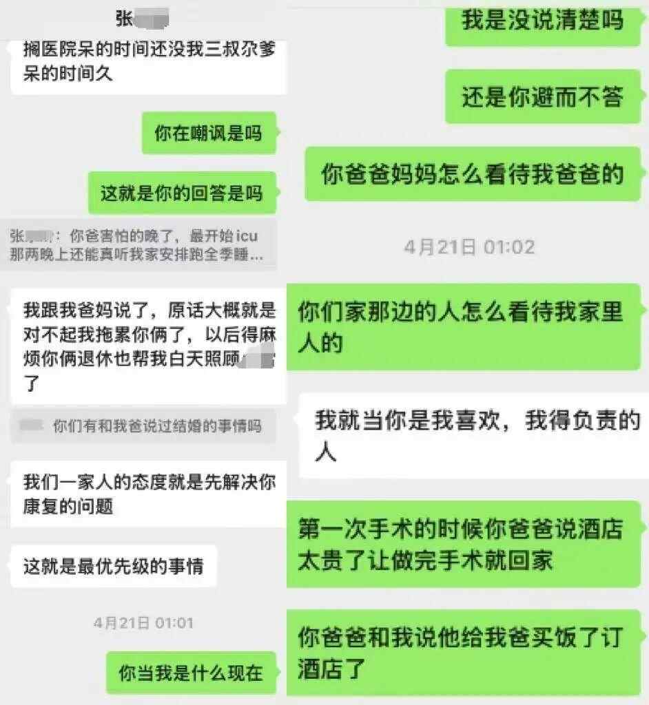 随着她的病情稳定,张某某一家的态度发生了转变。6月下旬,白女士发现对方微信不回、全家失联。为了寻求说法,她在护工陪同下坐火车赶到张某某家楼下,但仍未得到回应。“我在微信上问他妈妈能不能让我见他一面,他已经很久没回我消息了。当时我突然截瘫,又被抛弃,整个人都崩溃了。张某某对我来说就像是救命稻草,我只想找这个最熟悉、最信任的人。”白女士说。