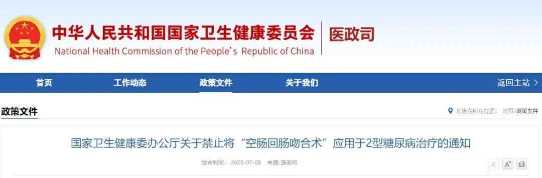 根据《关于禁止将“空肠回肠吻合术”应用于2型糖尿病治疗的通知》,为进一步加强医疗技术临床应用管理,国家卫健委组织对“空肠回肠吻合术治疗2型糖尿病”进行评估,评估认为该技术缺乏基础理论支撑和高质量循证医学依据,临床应用的安全性、有效性不确切。根据《医疗技术临床应用管理办法》(国家卫生健康委员会令第1号)有关规定,决定禁止将“空肠回肠吻合术”应用于2型糖尿病治疗。