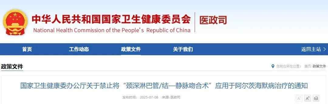 《关于禁止将“颈深淋巴管/结—静脉吻合术”应用于阿尔茨海默病治疗的通知》表示,国家卫健委近期获悉有个别医疗机构开展“颈深淋巴管/结—静脉吻合术”治疗阿尔茨海默病,为进一步加强医疗技术临床应用管理,国家卫健委组织专家对该技术进行评估,评估认为该技术处于临床研究早期探索阶段,适应证及禁忌证尚不明确,安全性、有效性缺乏高质量循证医学证据支撑。根据《医疗技术临床应用管理办法》(国家卫生健康委员会令第1号)有关规定,决定禁止将“颈深淋巴管/结—静脉吻合术”应用于阿尔茨海默病治疗。