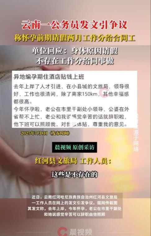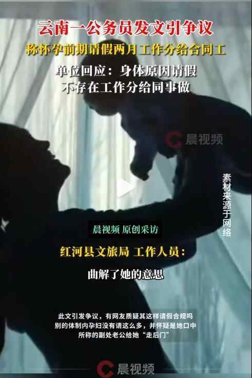 7月8日,其工作单位红河县文旅局的工作人员称,有些人曲解了该职工的意思,她怀孕后身体状况不好所以才批的假,不存在把工作分给合同制同事做,“我们这边都是两个人配合干,不存在丢不丢的问题。”关于她提到的副处老公,工作人员称不便评价,其他情况文旅局正在核实推进。(据7月9日潇湘晨报)