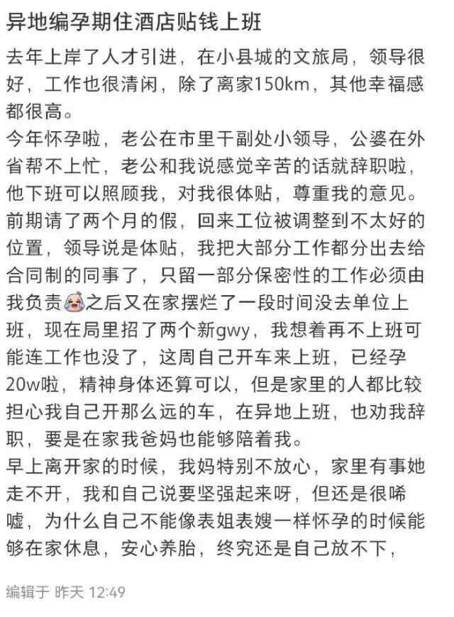 近日,一IP属地为云南的网友在社交平台发文称,自己去年通过人才引进通道,到小县城的文旅局工作,老公在市里干副处小领导,“上岸”后就怀孕,目前孕早期请假2个月,把工作都分给合同制同事。