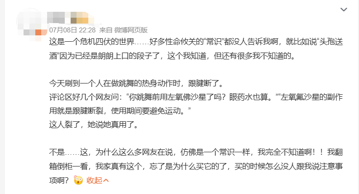 近日,有网友在互联网冲浪时发现,有人在做跳舞热身动作时跟腱断了,被追问后发现自己用了左氧氟沙星。该网友震惊于原来这么多人知道左氧氟沙星会影响到跟腱断裂。