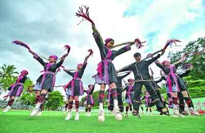 海南五指山市红星学校学生在练习苗族盘皇舞。新华社发