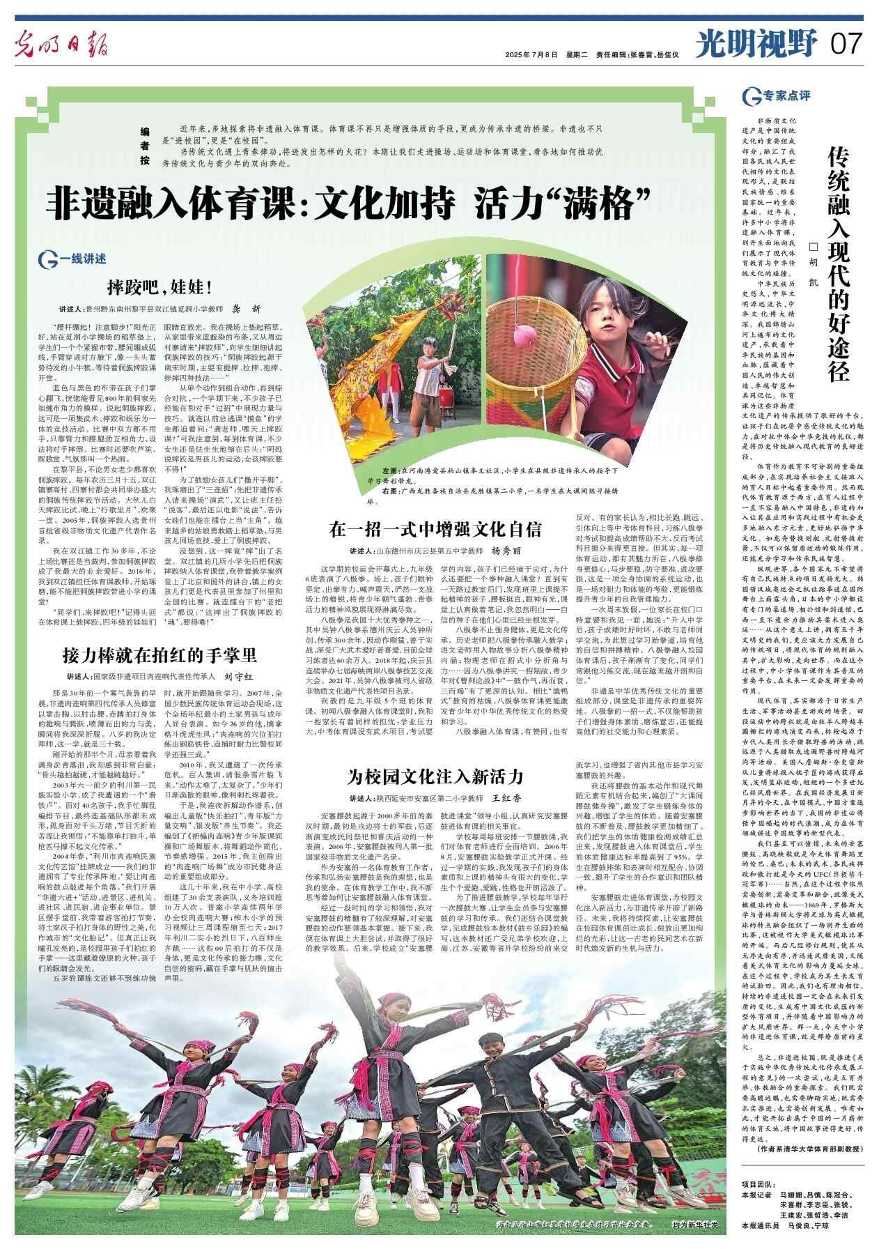 近年来,多地探索将非遗融入体育课。体育课不再只是增强体质的手段,更成为传承非遗的桥梁。非遗也不只是“进校园”,更是“在校园”。