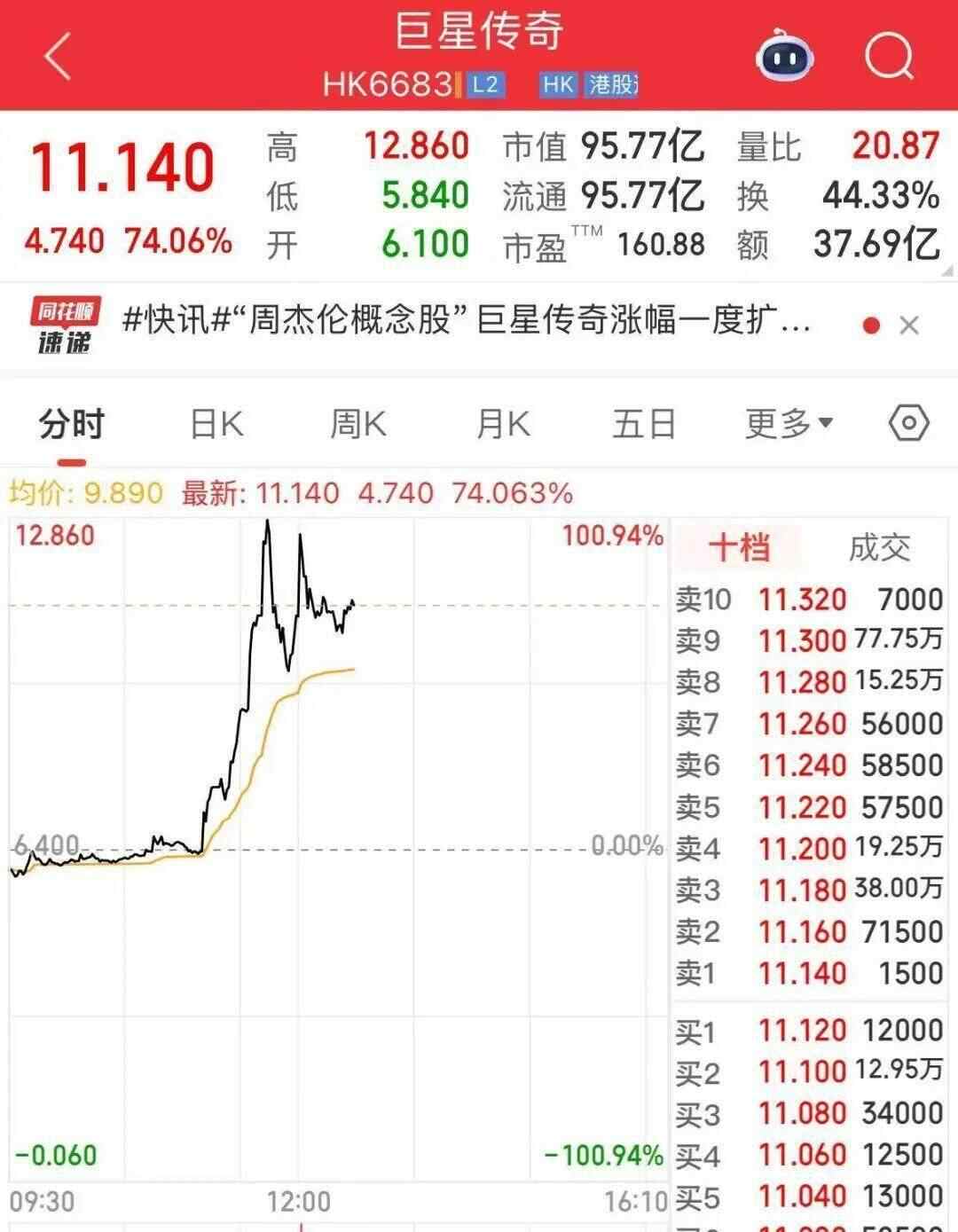 7月9日,港股“周杰伦概念股”巨星传奇盘中突然拉升,涨幅一度超过100%,不过随后涨幅有所回落。截至14时08分,巨星传奇涨74.06%,报11.14港元。