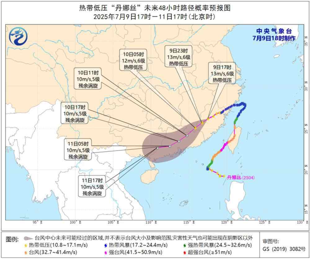广东省气象台7月9日傍晚预计,“丹娜丝”减弱后的低压中心,将在闽赣粤三省交界附近移入广东境内,之后继续向西南方向移动,强度缓慢减弱。