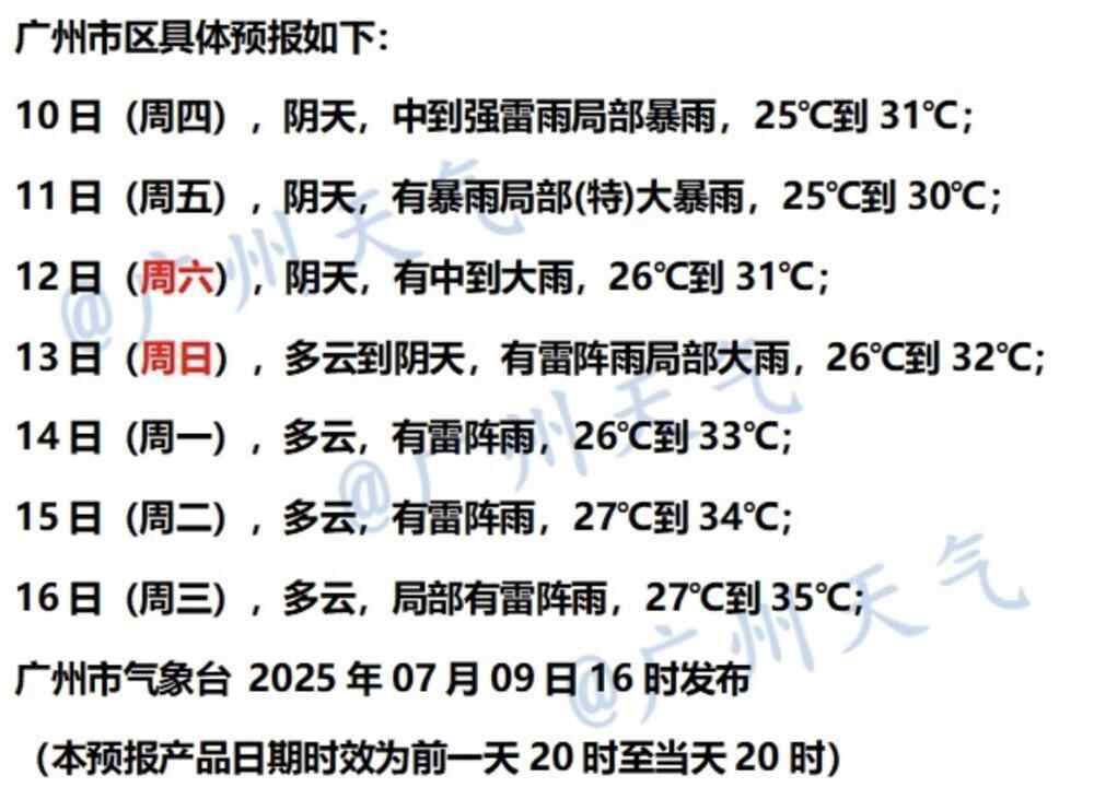 广州市气象台7月9日傍晚预计,10日至12日,受“丹娜丝”残涡和西南季风影响,广州有暴雨局部(特)大暴雨,过程累积雨量90毫米~160毫米,局部200毫米~300毫米,最大小时雨量70毫米~90毫米,雨时伴有8~10级短时大风、短时强降水、强雷电等强对流天气,高温有所缓解。预计13日起,受逐渐加强的副热带高压影响,广州降雨减弱,天气再趋炎热。