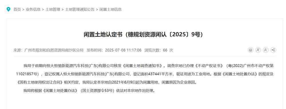 7月8日,广州市规划和自然资源局南沙区分局公示一则《闲置土地认定书》(穗规划资源闲认〔2025〕9号),认定恒大恒驰新能源汽车科技(广东)有限公司为权属人的一宗地块自2021年6月9日起为闲置用地,闲置原因为企业原因。