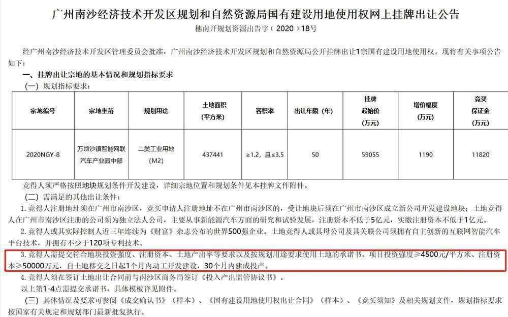 此外,根据竞得人恒大新能源2020年与南沙区商务局签订的《投入产出监管协议书》,该地块总投资不低于25亿,其中研发费用不低于20亿,投资强度不低于4500元/㎡,且承诺30个月内建成投产。若竞得人未能兑现上述承诺,南沙区有权解除《国有建设用地使用权出让合同》,对土地进行收回。