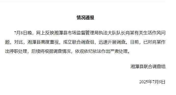 7月9日,湘潭县联合调查组通报湘潭县市场监督管理局执法大队队长肖某有关生活作风问题情况: