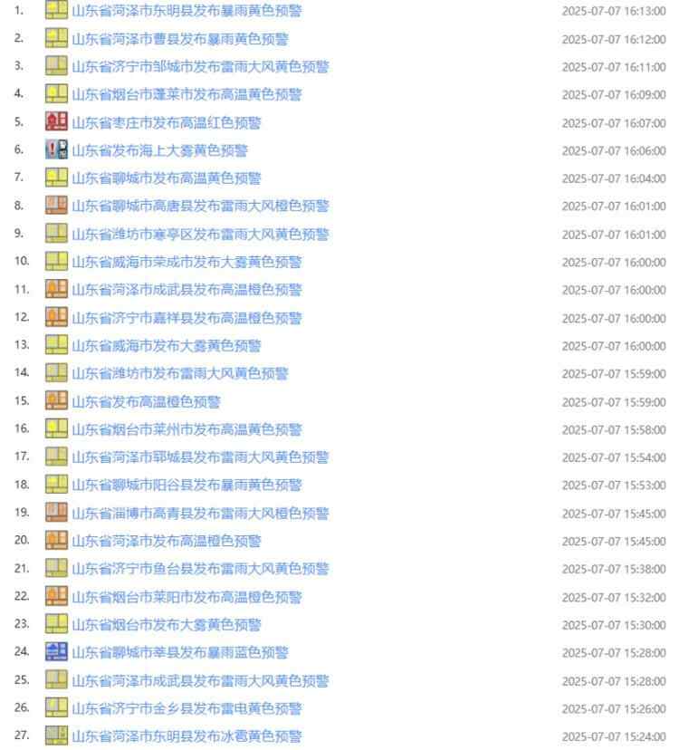 山东省气象台于7月7日14时40分发布强对流黄色预警:受副高边缘暖湿气流影响,预计7日下午到夜间,鲁西北、鲁中、鲁南和半岛北部地区将出现强对流天气,雷雨时伴有8~10级,局部11级以上雷雨大风,局部有冰雹和小时降水量50毫米以上的短时强降水。