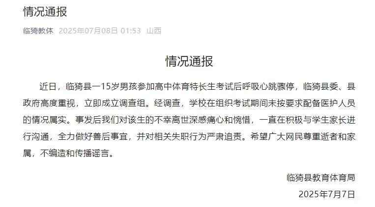 近日,临猗县一15岁男孩参加高中体育特长生考试后呼吸心跳骤停,临猗县委、县政府立即成立调查组。经调查,学校在组织考试期间未按要求配备医护人员的情况属实。事发后我们对该生的不幸离世深感痛心和惋惜,一直在积极与学生家长进行沟通,全力做好善后事宜,并对相关失职行为严肃追责。