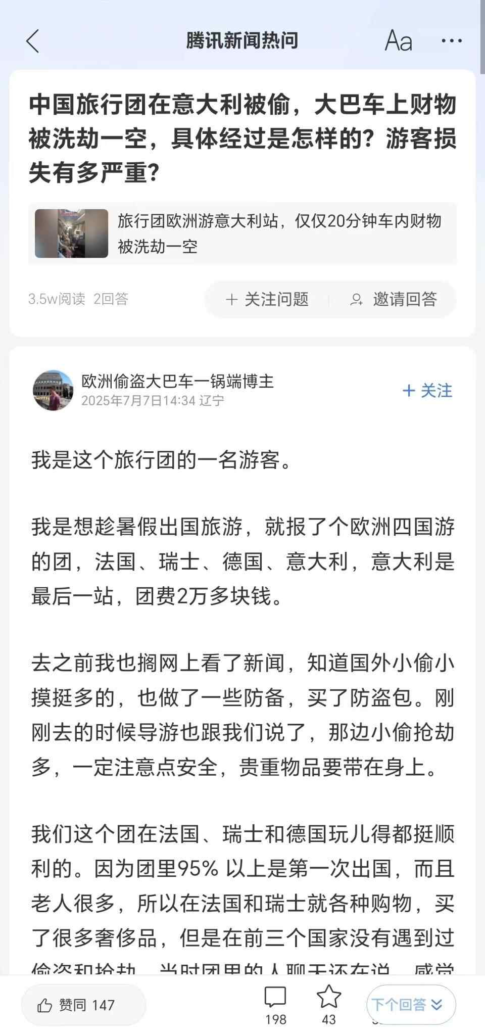 近日,中国一旅游团在意大利被“洗劫一空”的消息引发关注。