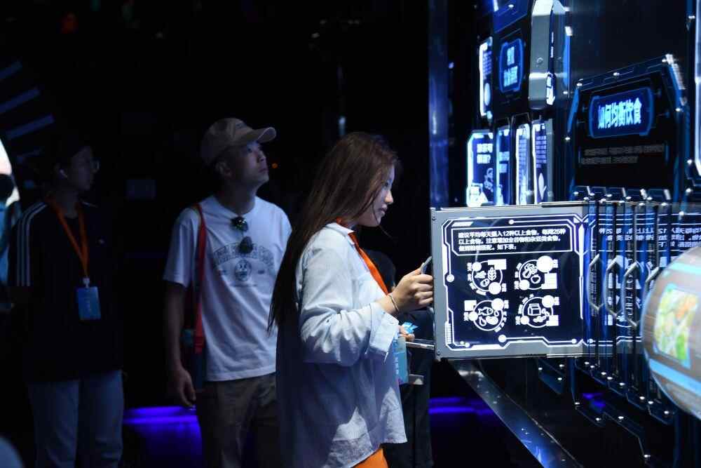 5日下午,一位参加夏令营活动的台湾青年在位于广东省珠海市的一家企业展厅内观看展品。新华社记者 洪泽华 摄