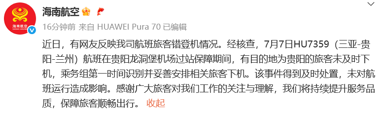 近日,有网友反映我司航班旅客错登机情况。经核查,7月7日HU7359(三亚-贵阳-兰州)航班在贵阳龙洞堡机场过站保障期间,有目的地为贵阳的旅客未及时下机,乘务组第一时间识别并妥善安排相关旅客下机。该事件得到及时处置,未对航班运行造成影响。感谢广大旅客对我们工作的关注与理解,我们将持续提升服务品质,保障旅客顺畅出行。