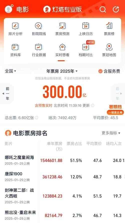 据网络平台数据,截至7月8日11时37分,2025年度我国电影票房(含预售实时)已突破300亿元。