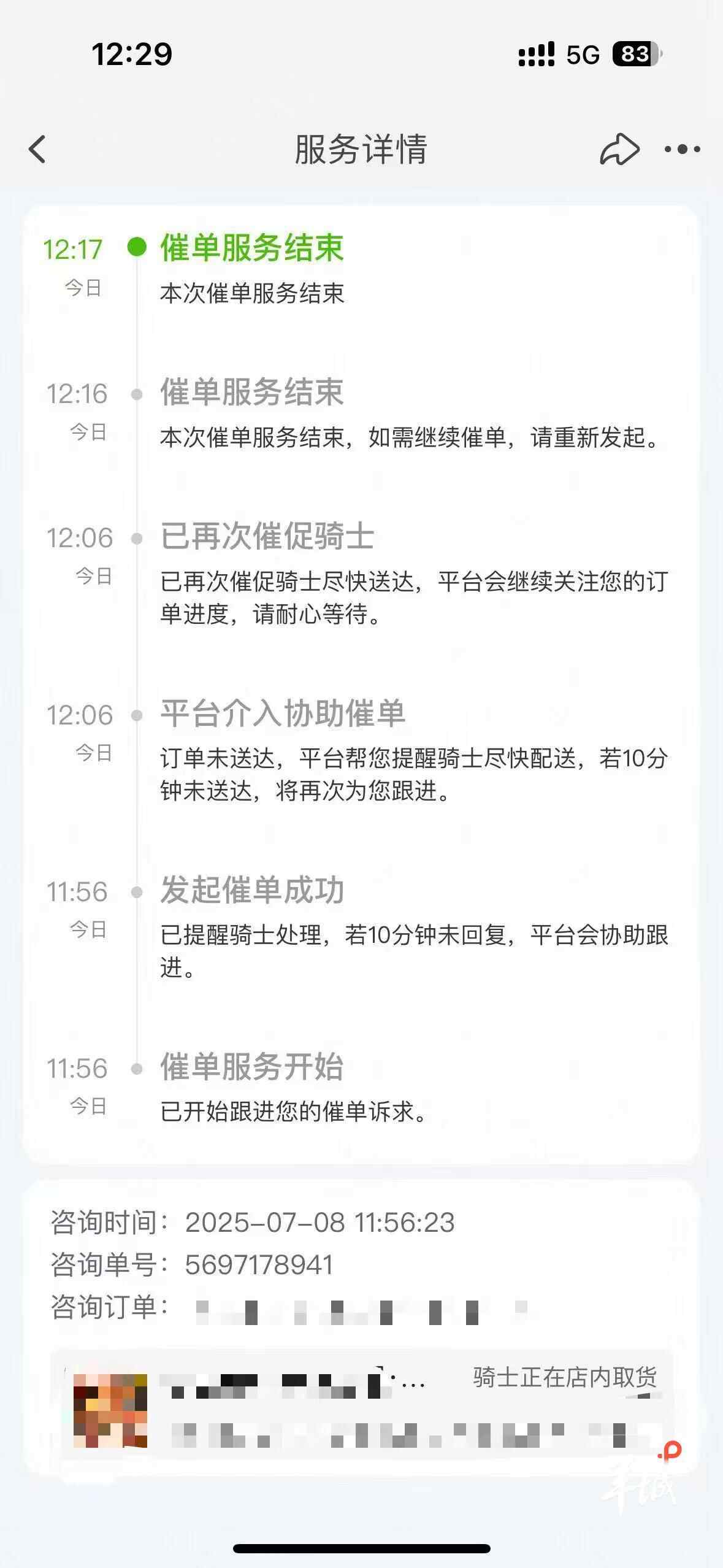 距离齐瑞预计的送餐时间已经过去1个小时了,看着界面上依旧一成不变的“预计5分钟后可送出”和沟通无门,她决定取消这一单,去楼下的门店觅食。
