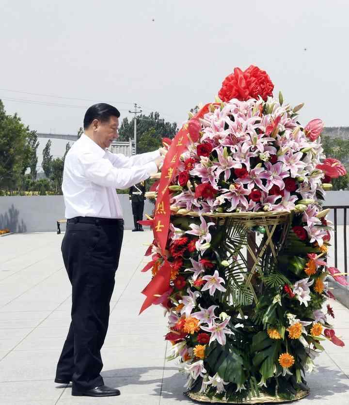 2017年6月21日,习近平总书记来到晋绥边区革命纪念馆,向革命烈士敬献花篮。