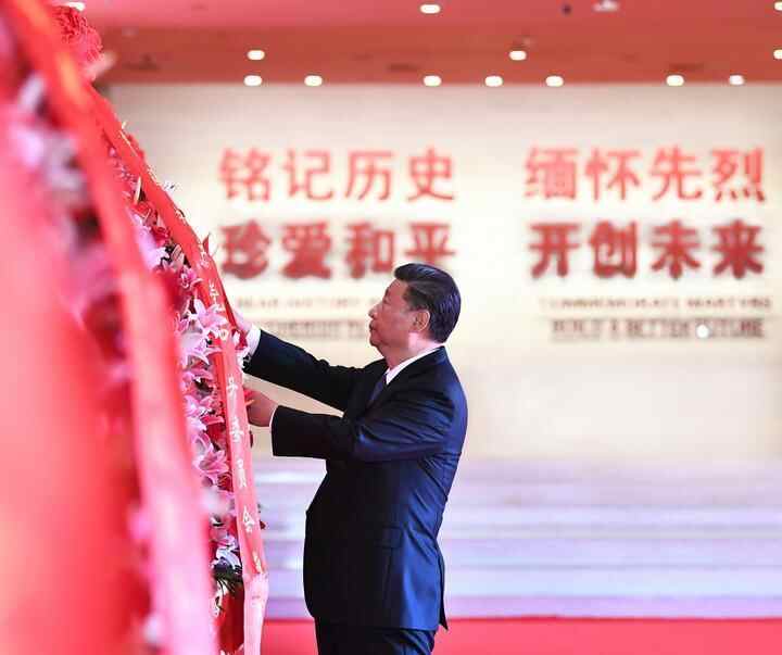 2020年9月3日上午,习近平出席纪念中国人民抗日战争暨世界反法西斯战争胜利75周年向抗战烈士敬献花篮仪式,整理花篮上的缎带。