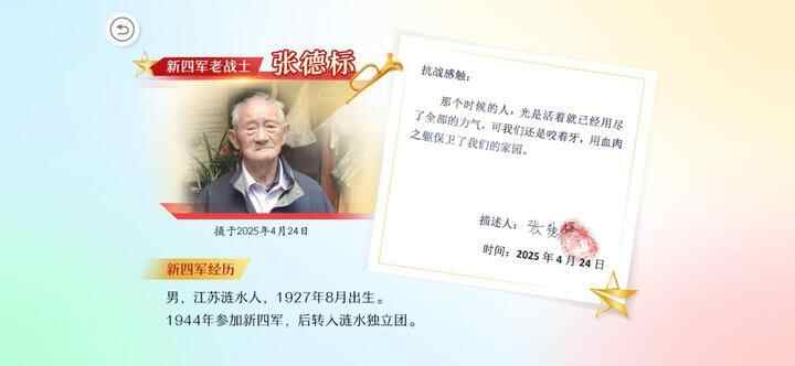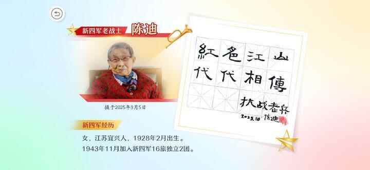 新四军经历:1938年,她加入新四军教导总队第八队(女子队)。在抗日报国的“经济战线”上,为守护党的“钱袋子”,她将金条缝入特制的背心贴身携带,人不离金、金不离人,力保金库分毫不损。