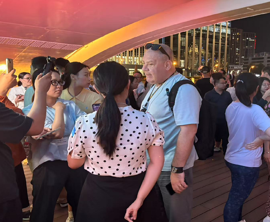 游船缓缓前行,两岸的意式风情区、解放桥、津湾广场等地标在灯光映衬下熠熠生辉,展现出天津中西合璧的文化特色。船上,嘉宾们聆听了关于海河历史与文化发展的讲解,不停用相机记录下两岸灯火辉煌的景象,感叹道:“天津的夜景美得像一幅画!”