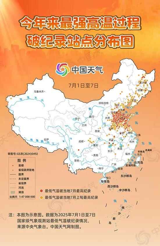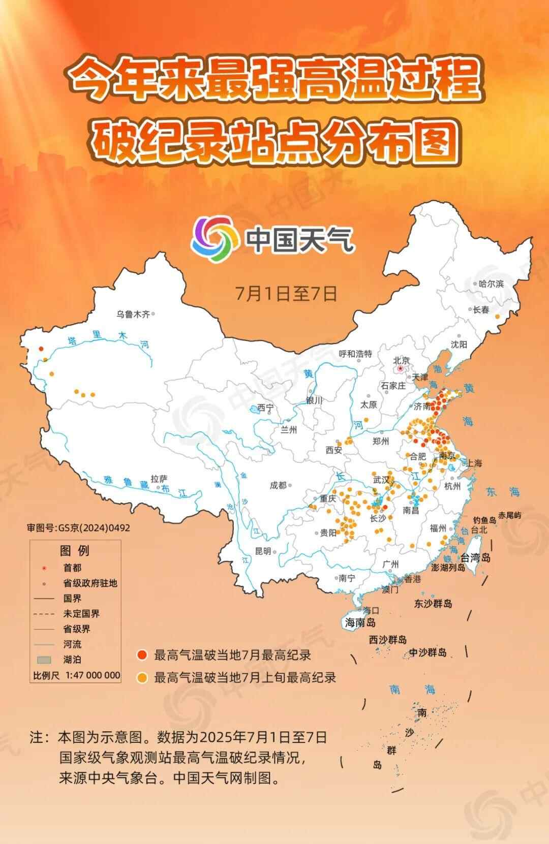 7月1日至7日,受西伸北抬的副热带高压控制,黄河以南地区气温居高不下,高温频繁,出现今年来范围最广、综合强度最强的高温过程,多地热到破纪录,中央气象台高温黄色预警连发7天。