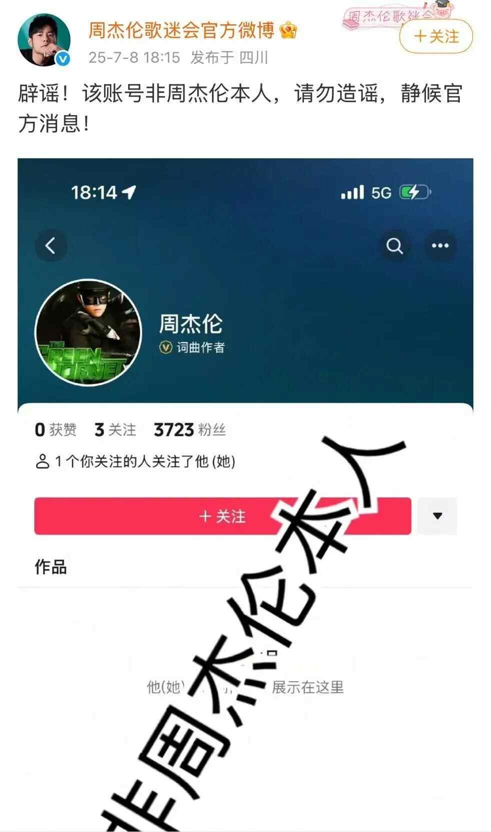 此外,@周杰伦歌迷官方微博 也打假抖音上出现的周杰伦账号,称“辟谣!该账号非周杰伦本人,请勿造谣,静候官方消息! ”