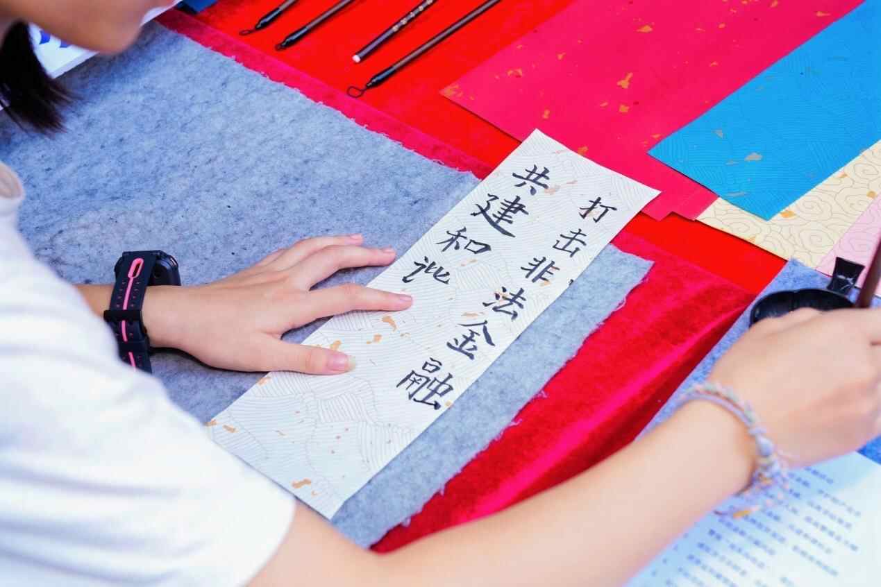 在养老保障规划区,新华保险广东分公司以“守护钱袋子,护航养老钱”为主线,设置两大互动环节。一是将金融知识普及与趣味体验深度融合,毛笔书写反诈标语活动,邀请社区长者与书法爱好者共同书写“守住钱袋子,护好幸福家”“警惕‘养老理财’陷阱,打击非法金融”等标语。书法爱好者们挥毫泼墨,一幅幅墨宝成为“反诈宣言”,吸引众多居民驻足围观、拍照分享。二是叠叠乐游戏互动,将非法金融活动制成模型,参与者需快速击倒指定目标。参与游戏的王阿姨表示:“这种游戏既好玩又能学知识!以前总觉得诈骗离自己远,今天才知道‘高息养老项目’‘非法代理维权’都是有风险的。”通过“动手+动脑”的沉浸式体验,居民对非法金融活动的识别能力显著提升。