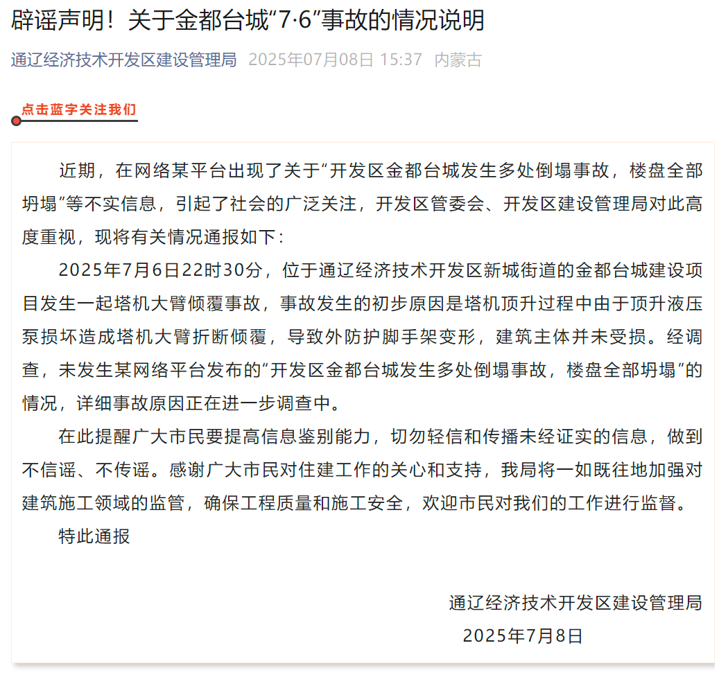 2025年7月6日22时30分,位于通辽经济技术开发区新城街道的金都台城建设项目发生一起塔机大臂倾覆事故,事故发生的初步原因是塔机顶升过程中由于顶升液压泵损坏造成塔机大臂折断倾覆,导致外防护脚手架变形,建筑主体并未受损。经调查,未发生某网络平台发布的“开发区金都台城发生多处倒塌事故,楼盘全部坍塌”的情况,详细事故原因正在进一步调查中。