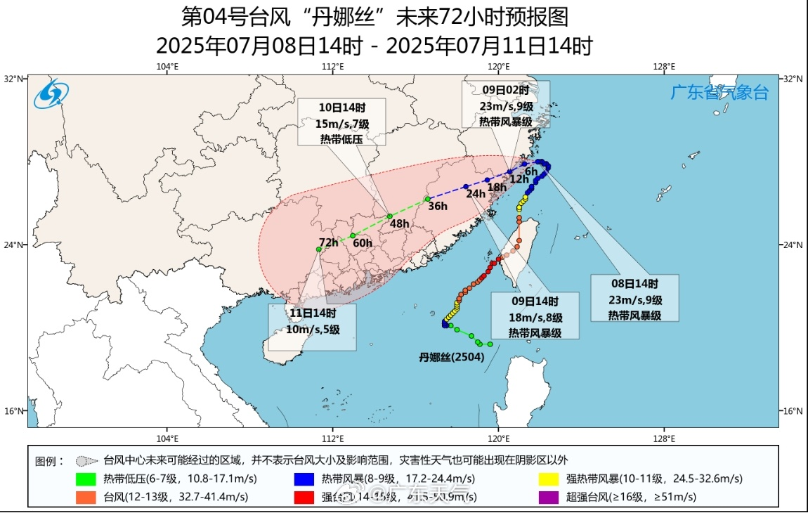 广东何时能“退烧”?据悉,台风“丹娜丝”于8日晚上11点45分前后在温州瑞安沿海再次登陆,登陆时中心附近最大风力8级(20米/秒),中心最低气压992百帕。预计一路经过浙江、福建、江西,将于10日前后带着残余环流来到广东!
