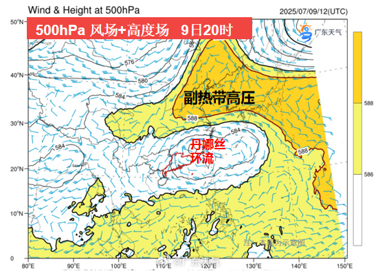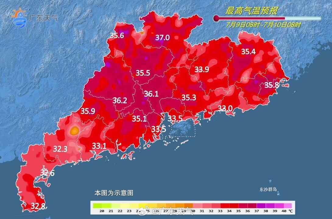 @广东天气 预计,9日广东仍以高温伴分散强雷雨天气为主,中北部市县最高气温35℃~37℃;10-12日,受“丹娜丝”残余环流和季风影响,广东大部将有一次降水趋于明显,高温有所缓解。
