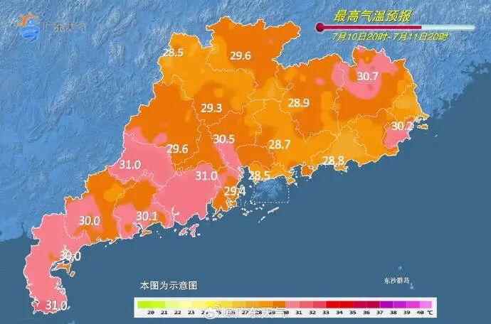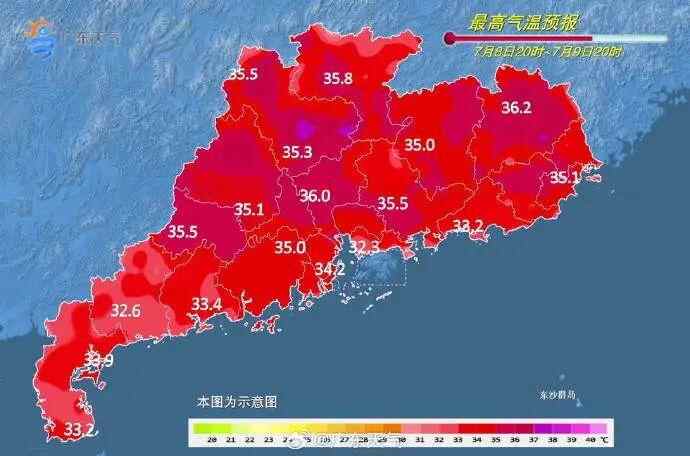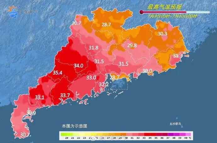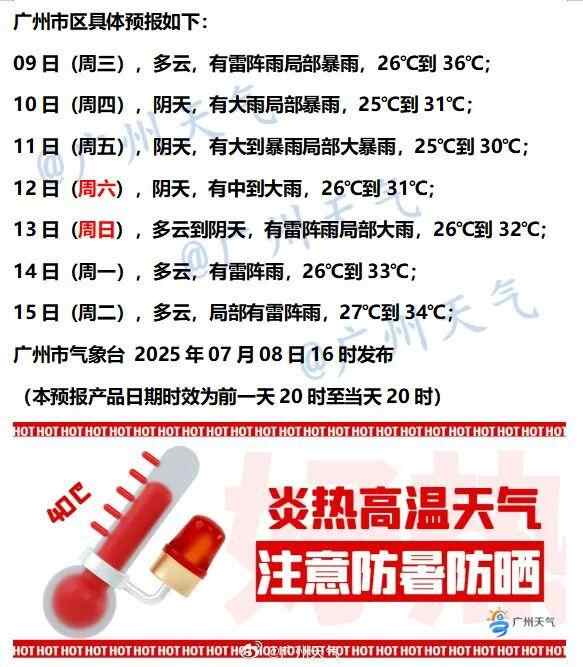 据@广州天气 消息:7月9日广州高温炎热持续,户外活动、施工作业要格外注意防暑防晒,及时补水;午后要小心雷雨袭扰。10到12日受低涡和季风辐合影响,有大到暴雨局部大暴雨,高温也将有所缓解。