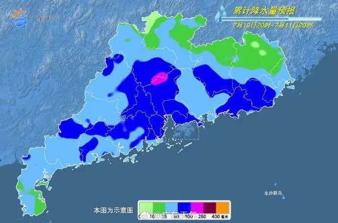 11日,珠江三角洲、粤东和河源、韶关、清远三市的南部阴天,有暴雨局地(特)大暴雨,其余市县阴天到多云,有中到强雷雨局部暴雨。