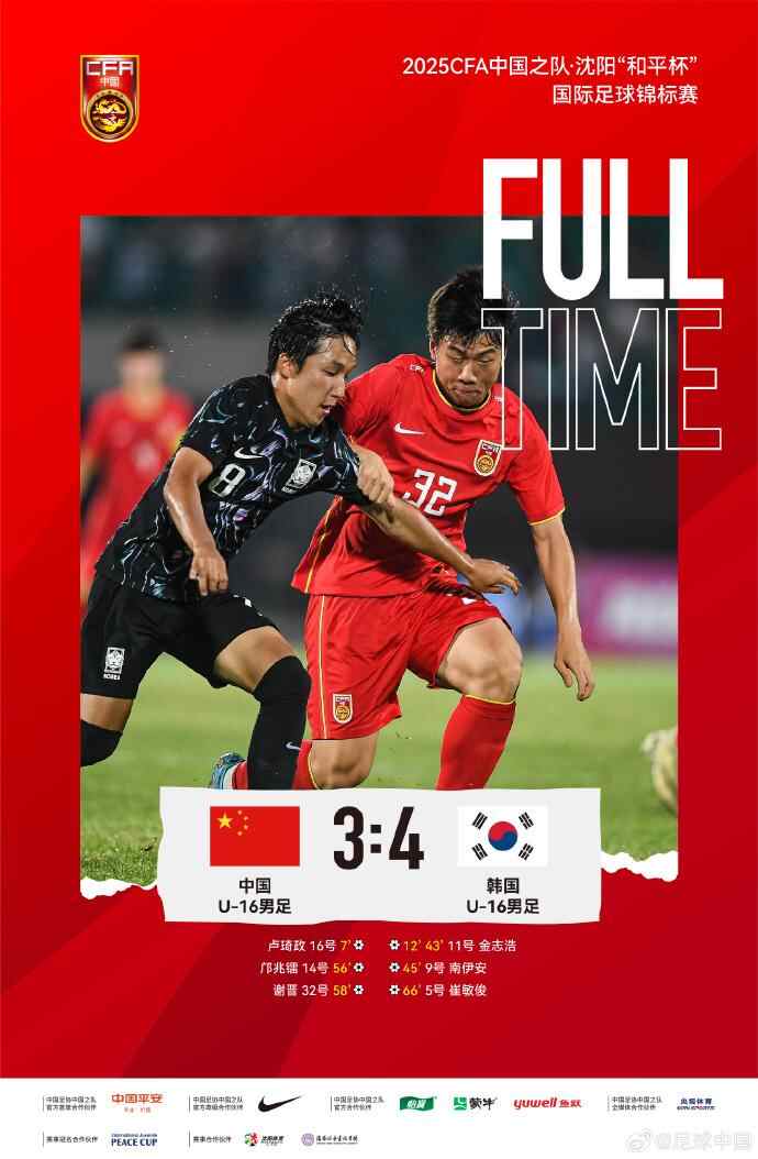 北京时间7月8日19点35分,2025CFA中国之队·沈阳“和平杯”国际足球锦标赛第三轮,中国U16男足对阵韩国U16男足的比赛在沈阳城市体育场进行。中国U16男足3:4惜败韩国队,加上此前“准绝杀”乌兹别克斯坦队、战平日本队,以一胜一负一平的战绩获得第三名。