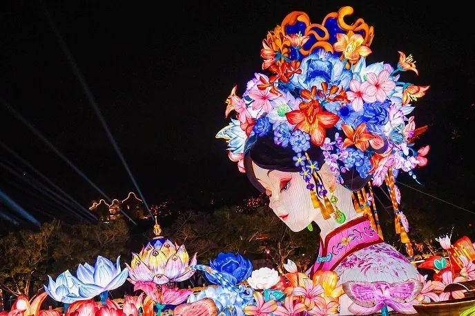 值得一提的是,2025年粤港澳大湾区灯会自1月22日开园以来,已吸引海内外约71万游客入园赏灯。灯会中特别呈现了“簪花女神”灯组——该设计融合妈祖文化与现代美学,以动态光影展现青年版妈祖的灵动形象,背景结合疍家水乡风貌,传递出“传统焕新”的文化张力。