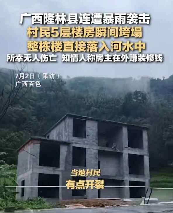 7月2日,广西百色市隆林县新州镇某村,一桩建在河边的五层房屋整体垮塌倒入河中。