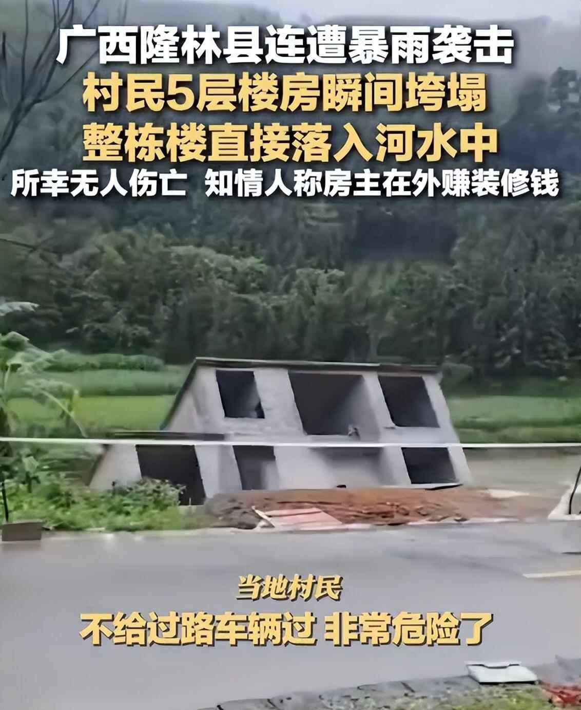 据红星新闻,7月2日,广西百色市隆林县新州镇某村,一桩建在河边的五层房屋整体垮塌倒入河中。