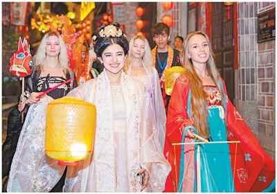 外国游客身着汉服在江西庐山西宁街体验民俗文化。