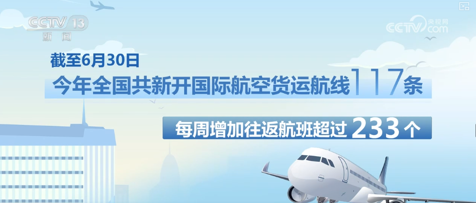 据中物联航空物流分会统计,截至6月30日,2025年,全国共新开国际航空货运航线117条,每周增加往返航班超过233个。