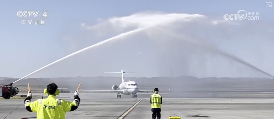 7月1日,喷涂有五星红旗的国航C909飞机首次执飞呼和浩特—乌兰巴托—呼和浩特航线,开启了国产飞机载旗执行国际商业航班的新阶段。74名旅客从呼和浩特白塔国际机场起飞,经过了一个多小时的飞行抵达乌兰巴托国际机场,机场以民航界最高礼遇“水门仪式”相迎。