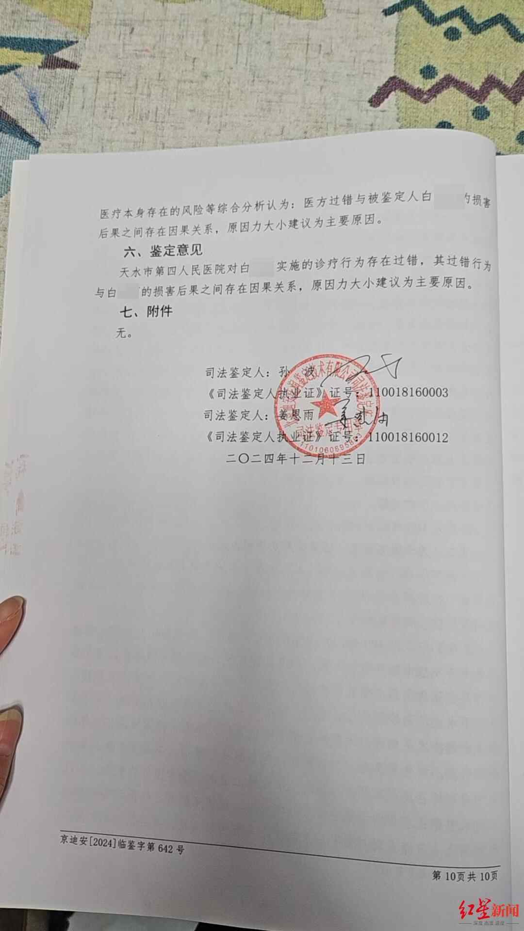 白女士提供的司法鉴定书显示,2024年12月13日,鉴定意见为天水市第四人民医院对白女士实施的诊疗行为存在过错,其过错行为与白女士的损害后果之间存在因果关系,原因力大小建议为主要原因。