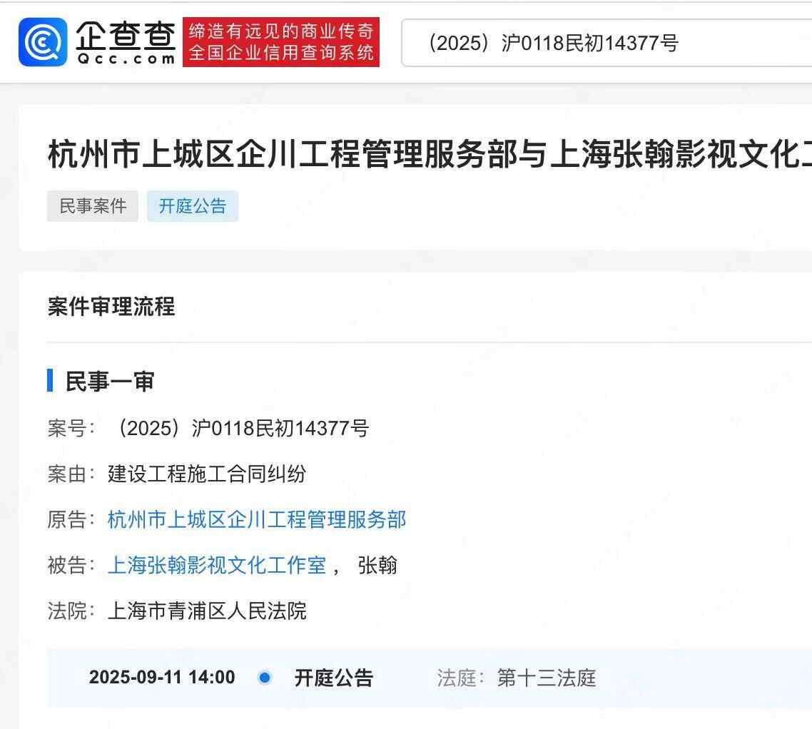 企查查APP显示,近日,张翰、上海张翰影视文化工作室新增一则开庭公告信息,原告为杭州市上城区企川工程管理服务部,案由为建设工程施工合同纠纷,案件将于9月11日在上海市青浦区人民法院开庭审理。